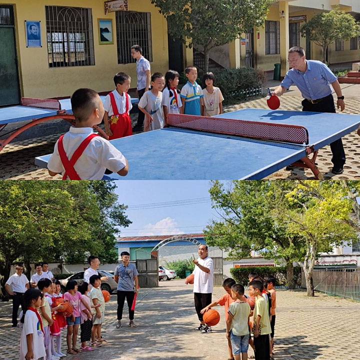 本次活動分兩個階段開展。第一階段,以愛國主義教育為切入點,分別在良田小學和東山小學開展。黃家偉帶領團員與全體師生開展升國旗、唱國歌活動,在激昂的歌聲中向國旗敬禮、向祖國致敬。隨后,黃家偉代表集團黨委向兩所學校捐贈物資,用于改善當?shù)剞r村教學條件。在學生們課間休息時間,團員們還陪伴學生們上了一堂豐富有趣的體育課。團員們還與學校老師進行交流座談,表達了關心與寄語。