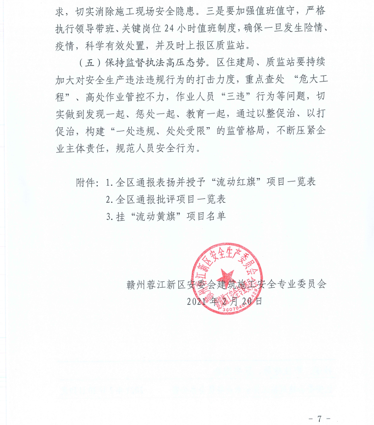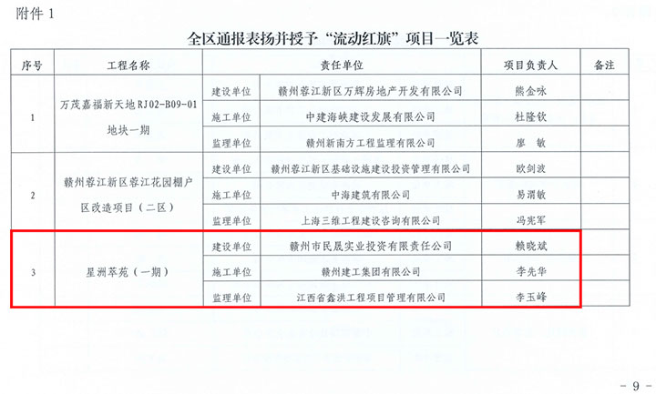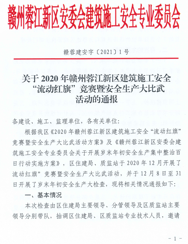 3月2日上午,贛州蓉江新區(qū)表彰通報(bào)2021年贛州蓉江新區(qū)建筑施工安全“流動(dòng)紅旗”競賽暨安全生產(chǎn)大比武活動(dòng)開展情況,其中,星洲萃苑(一期)項(xiàng)目在此次評比中喜獲“流動(dòng)紅旗”,并獲得贛州蓉江新區(qū)安委會(huì)發(fā)放的經(jīng)濟(jì)獎(jiǎng)勵(lì)12000元整。