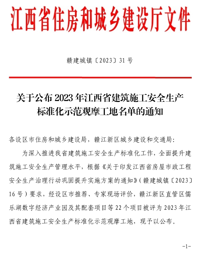 日前,贛州城投集團(tuán)星洲九樾等2個項目獲評2023年江西省建筑施工安全生產(chǎn)標(biāo)準(zhǔn)化示范觀摩項目。