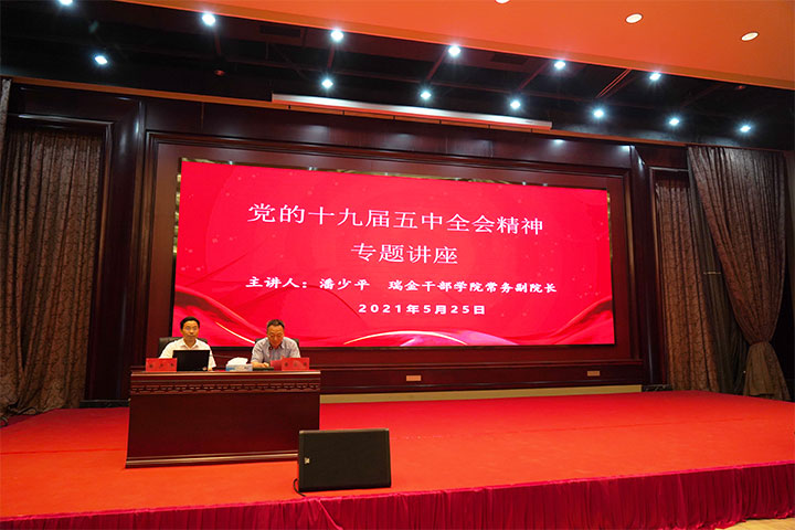 5月25日,贛州城投集團黨委舉辦黨的十九屆五中全會精神專題講座。市委講師團成員、瑞金干部學(xué)院常務(wù)副院長潘少平應(yīng)邀授課,集團黨委副書記(主持工作)、總經(jīng)理李國泉及集團全體高管、市管干部出席講座,集團黨委副書記黃家偉主持。
