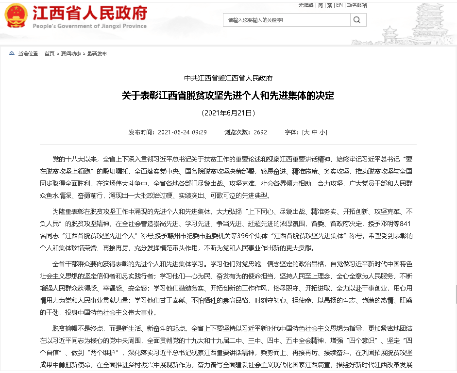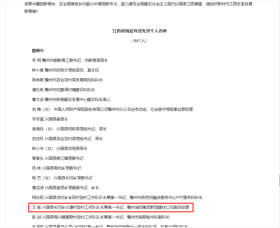 6月23日,省委、省政府召開(kāi)全省脫貧攻堅(jiān)總結(jié)表彰大會(huì),表彰一批在打贏脫貧攻堅(jiān)戰(zhàn)中作出突出貢獻(xiàn)的個(gè)人和集體,其中,興國(guó)縣長(zhǎng)岡鄉(xiāng)大塘村駐村工作隊(duì)隊(duì)長(zhǎng)兼第一書(shū)記,贛州城投集團(tuán)新型建材公司副總經(jīng)理王彪獲“江西省脫貧攻堅(jiān)先進(jìn)個(gè)人”榮譽(yù)稱號(hào)。