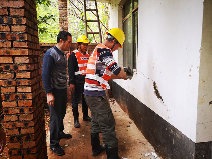 收到群眾訴求后,贛州建工集團(tuán)黨支部明確責(zé)任分工,由贛州建工集團(tuán)駐蓉江花園(四區(qū))項(xiàng)目部的工作人員前往實(shí)地了解情況。該村村民邱家飛年近七旬,所居住的房屋因年久失修,導(dǎo)致門廳墻面破損,房屋內(nèi)外均存在一定程度的裂縫。此外,村里另有一對姐弟居住的房屋由于結(jié)構(gòu)問題也存在幾處裂縫。