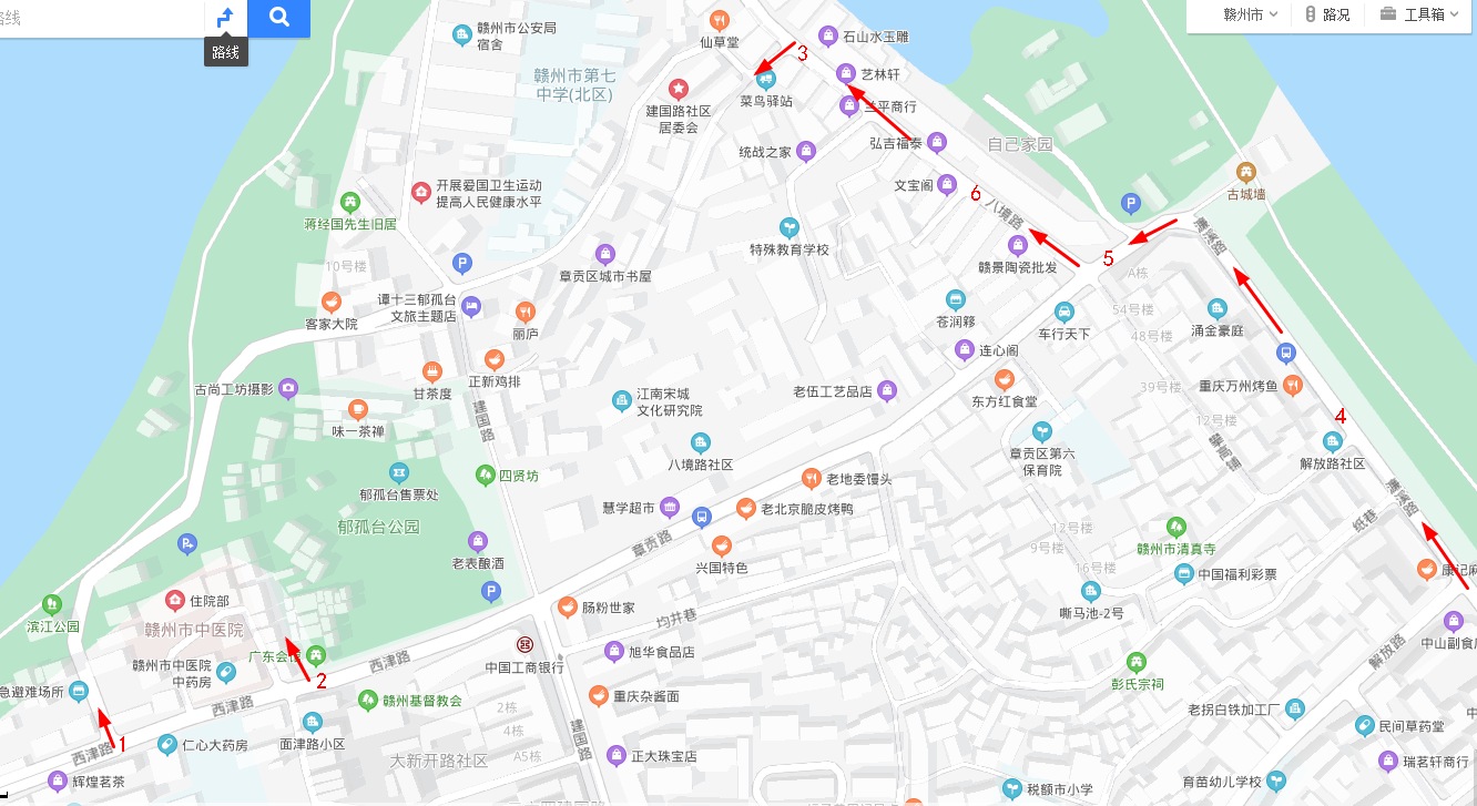 三、限流管理期間,持有通行證的郁孤臺街區(qū)內(nèi)居民或車輛,請統(tǒng)一從八境路支巷景區(qū)入口(國力教育、贛七中方向)進(jìn)出。路線方案為:濂溪路(如圖紅色標(biāo)記4)→章貢路(如圖紅色標(biāo)記5)→八境路(如圖紅色標(biāo)記6)→八境路支巷景區(qū)入口(如圖紅色標(biāo)記3)。