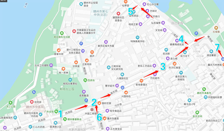 建議線路二:6建國路→2西津路與建國路、章貢路交匯紅綠燈→3章貢路→4八境路→5八境路支巷景區(qū)入口