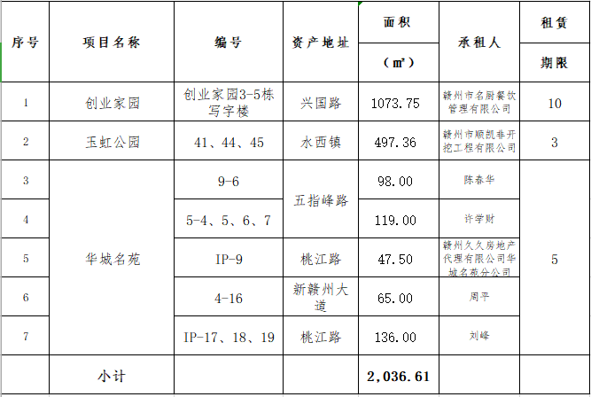 2021528下午14時(shí)30分,在贛州市公共資源交易中心舉行的贛州振興實(shí)業(yè)有限責(zé)任公司五指峰路等十三宗資產(chǎn)公開(kāi)招租(項(xiàng)目編號(hào)GZCQ2021073),現(xiàn)將公開(kāi)招租成交情況公示如下: