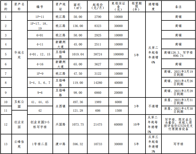 贛州振興實(shí)業(yè)有限責(zé)任公司委托江西江南拍賣(mài)有限公司,定于2021年5月28日14:30開(kāi)始在贛州市公共資源交易中心(長(zhǎng)征大道9號(hào))進(jìn)行國(guó)有資產(chǎn)公開(kāi)招租,現(xiàn)歡迎符合條件的單位或個(gè)人前來(lái)報(bào)名參加競(jìng)租。