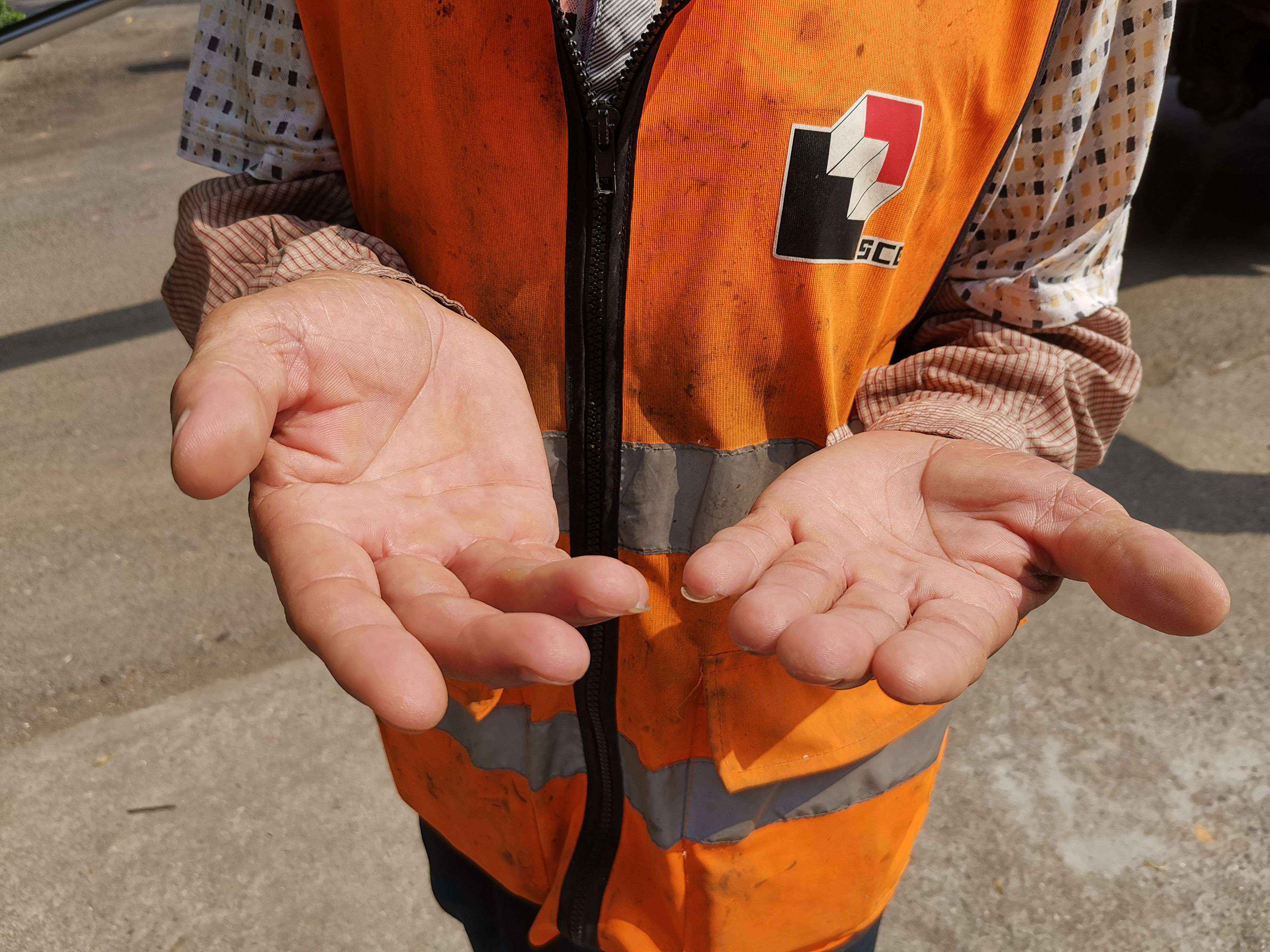 為安全起見,登高作業(yè)車上的作業(yè)籃上一般都有兩個(gè)人形成一組,一人拿穩(wěn)樹枝配合一人鋸,以防樹枝自然掉落造成意外。在登高作業(yè)車平臺(tái)上站了2個(gè)小時(shí)后,陳道桂所在的班組才修剪完3棵大樹,趁登高作業(yè)車水平挪動(dòng)位置時(shí),他才能下到地面上休息短暫的1、2分鐘,而他身上的衣服早已被汗水浸透。
