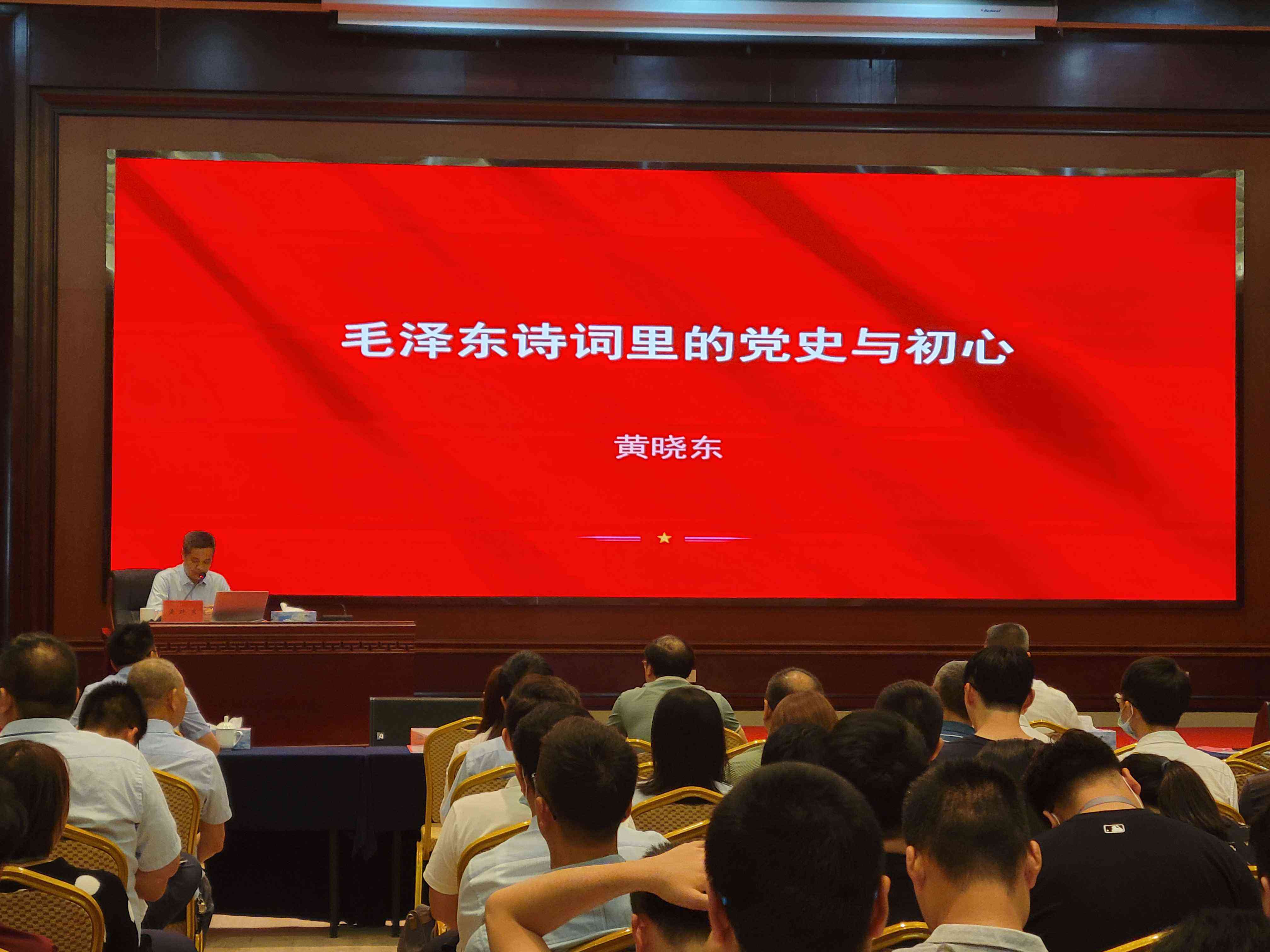 黃曉東同志以《毛澤東詩詞里的黨史與初心》為主題,以毛澤東同志的革命道路為主線,品讀毛澤東同志不同時期的詩詞,從離愁別恨里的黨史與初心等10個方面,回溯偉人立志報國救亡、書生意氣的青年時代、艱苦卓絕的革命崢嶸歲月、如火如荼的社會主義革命和建設歷程,彰顯偉人獨具魅力的個性情懷和豪邁氣概,闡述了共產(chǎn)黨人的初心與使命。