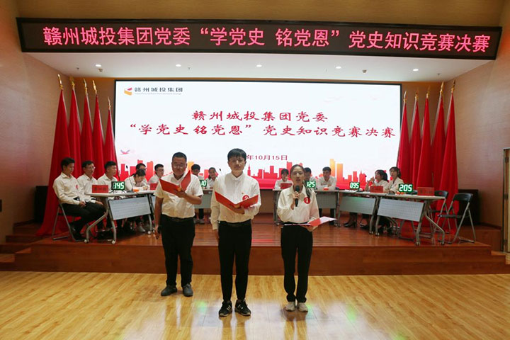 10月15日,贛州城投集團黨委舉辦"學(xué)黨史 銘黨恩"黨史學(xué)習(xí)教育知識競賽決賽。市國資委黨委黨史學(xué)習(xí)教育領(lǐng)導(dǎo)小組副組長、黨委委員、副主任黃曉東,市委組織部組織三科科長賴雯龍,市委黨史研究室正科級干部陳曄明,市委黨史研究室宣教科臨時負(fù)責(zé)人許偉卿應(yīng)邀到場指導(dǎo)。集團黨委書記、董事長提名人選劉曉方,集團黨委副書記、總經(jīng)理提名人選郭閩軍及其他黨員高管出席活動。來自集團各黨支部(黨總支)的6支代表隊的參賽選手及黨員、群眾代表等共約90人參加。